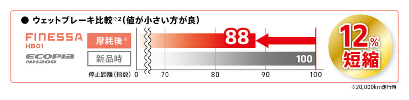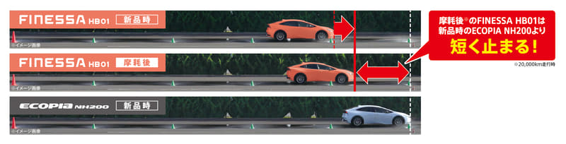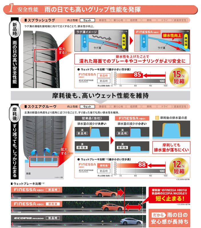 第1弾商品となる「フィネッサ HB01」は、商品設計基盤技術「エンライトン」を搭載し、高い“ウェットグリップ性能”と快適な車内空間を実現する静粛性を高めたコストパフォーマンスに優れた商品。新パターンのショルダー部に採用した「スプラッシュラグ」が主溝からの排水性を向上したほか、主溝に「スクエアグルーヴ」を適用することで、摩耗しても溝体積の変化をより小さく抑え、高い排水性の維持を実現。既存の低燃費タイヤ「エコピア NH200」対比でウェットブレーキ制動距離を15%短縮。さらに、2万km走行後の「フィネッサ HB01」でも新品時の「エコピア NH200」対比で12%短縮に成功。突然の雨や濡れた道路でも、しっかり止まる・曲がる性能は摩耗後まで考慮し設計していて、新品から履き替えまでさらなる安心・安全を両立。また、新パターンに搭載される「スリットサイレンサー」で走行中のノイズを気になりにくい音質へとチューニング。スムーズなアスファルト舗装路でのパターンノイズを「エコピア NH200」対比7%低減することで、静かでより快適な車内空間を両立している。