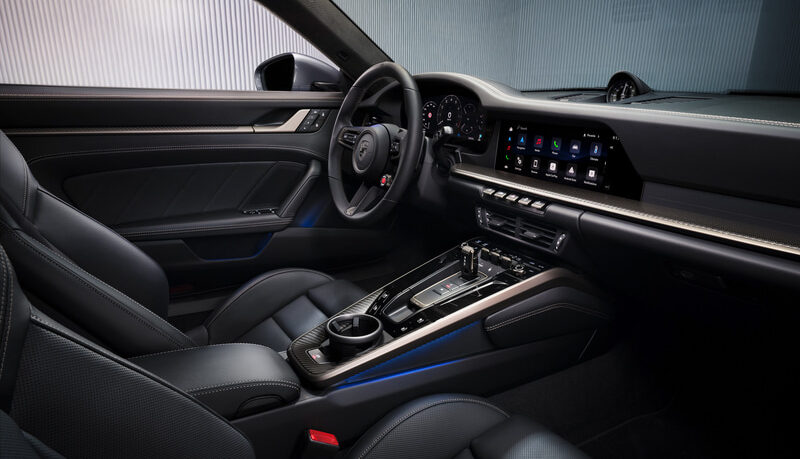 インテリアではドアパネル、ステアリングホイール、ダッシュボード、センターコンソールまわり、デコレーティブステッチ、スポーツクロノストップウォッチ、メーターパネルなどにターボナイトのアクセントが与えられ、今回初めてネオジムトリムを備えたカーボン構造のトリムストリップと、ブラックの裏地が付いたパーフォレーテッドマイクロファイバーヘッドライナーが専用インテリアの一部に採用。『911 ターボ S クーペ』は、標準で2シーターモデルとして提供され、要望に応じて追加料金なしでリアシートシステムを設定できる(カブリオレでは2+2のシート構成が標準)。新型『911 ターボ S』には、HDマトリックスLEDヘッドライトをはじめ、タイヤ温度計を含むスポーツクロノパッケージ、専用チューニングされたPASMサスペンション、PDCC電気油圧式ロールサポート、チタン製スポーツエグゾーストシステムなどが標準装備される。インテリアでは、メモリー機能付18wayアダプティブスポーツシートプラスやヘッドレストの”turbo S”レタリングが標準装備として採用され、シート表面とドアパネルに施されたターボS専用のエンボス加工は、初代「911 ターボ 930」のデザインの特徴を再解釈したものになる。