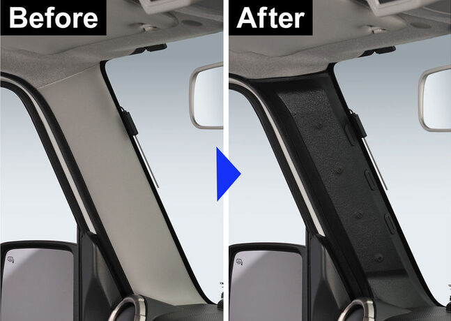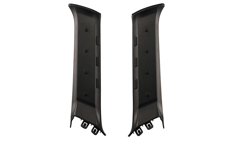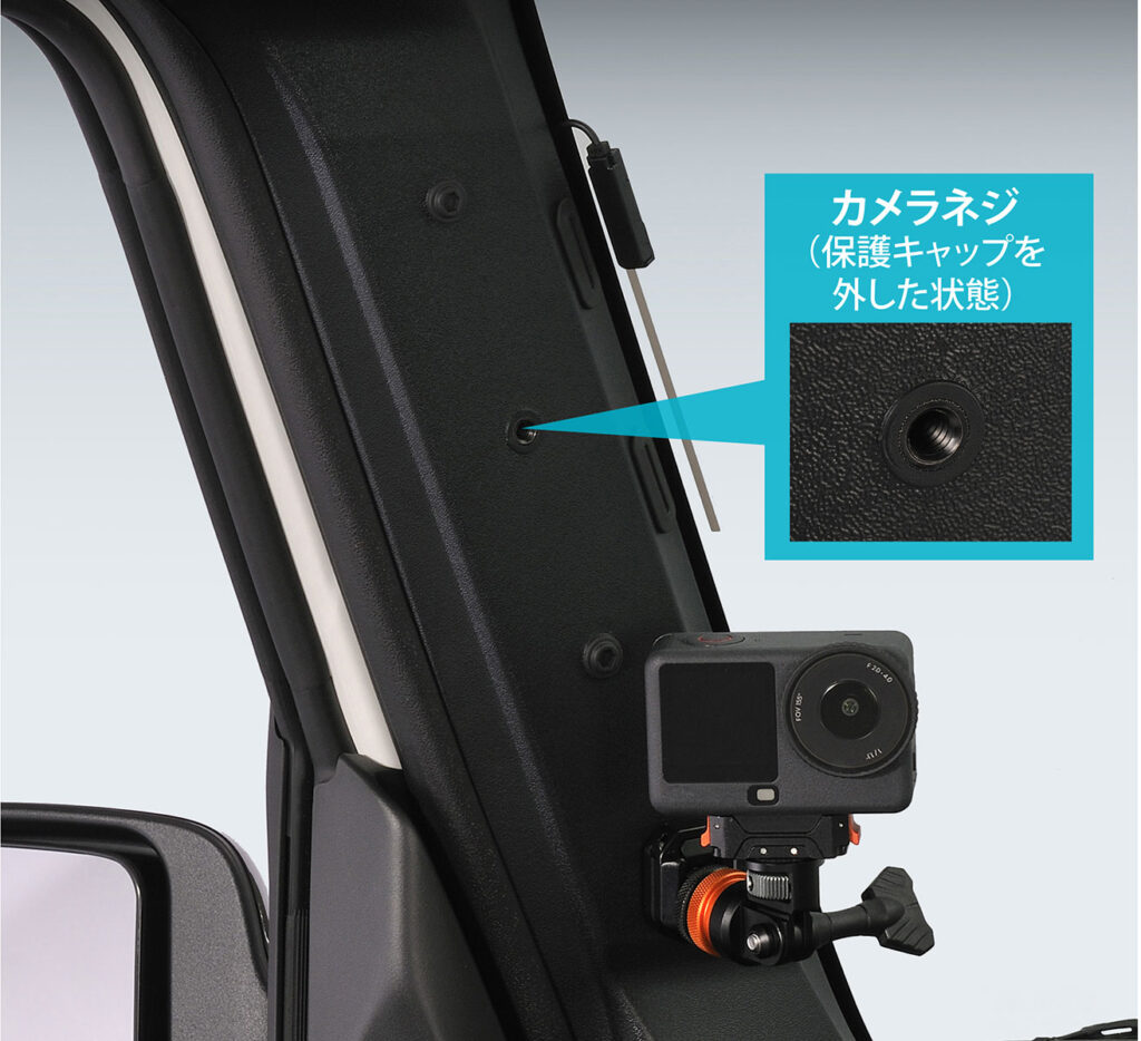「ジムニー専用Aピラーカバー運転席側/助手席側セット(CX530K)」は、『ジムニー」の内装で目立つ灰色の純正Aピラーカバーをブラックアウトカスタムするための純正交換用ピラーカバー。フロントまわりを黒で統一することで、高級感と引き締まった印象が生まれ、車内全体の雰囲気を向上させる。取り付けは、純正Aピラーカバーと交換するだけで、だれでも手軽にドレスアップを楽しむことができる。また、左右のピラーカバーには、カメラネジ(1/4インチ雌ネジ)を各4個内蔵しており、アクションカメラのマウントや左右のネジをベルトなどで連結するなど、自由度の高いオリジナルカスタムが可能。製品サイズは、幅114㎜×高さ450㎜×奥行46㎜、重量320g。但し、カメラネジにアタッチメントを取り付けた状態では走行できないので注意が必要。