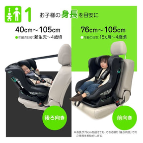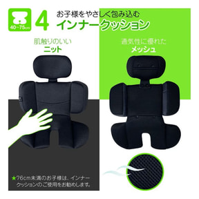 前後からの衝撃だけでなく側面からの衝撃にも対応した設計で、子供をしっかり保護。新生児から使用できるほか、子供の成長に合わせてリクライニング調整機構(3段階)および肩ベルト連動式のヘッドサポートで、フィッティングをアジャストできる為、常に最適な姿勢を保てる。また、頭部を優しく包み込むインナークッションは、肌触りのよいニット素材と通気性に優れたメッシュ素材のリバーシブル仕様を採用。さらに、強い日差しを遮る大型サンシェードや丸洗い可能なカバー類などで、安全に長くかつ清潔に使用できる。車両への脱着も確実かつ容易で、家族の使いやすさも考えた機能が充実したモデルとなっている。