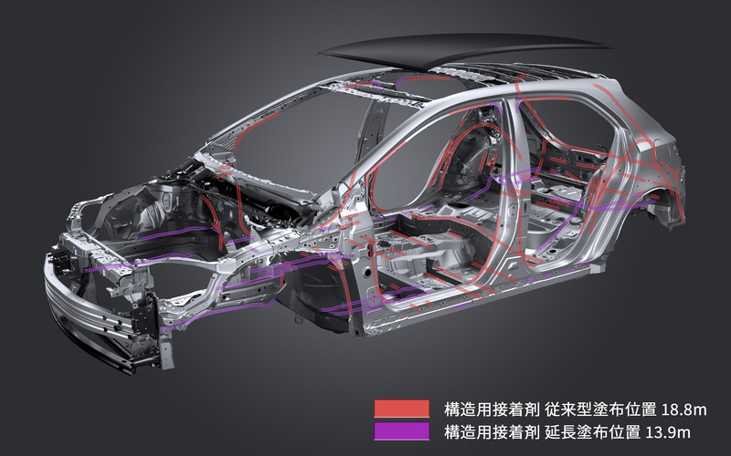 今回の一部改良では、吸気冷却性能とボディ骨格の改善などを実施。吸気冷却性能の改善では、長時間の全開走行でエンジンルーム内の温度が上昇した場合でも安定して高いエンジン出力を維持させるため、エンジンが高回転時に作動する2次吸気口(エアクリーナー下方に配置)にクールエアダクトを追加。クールエアダクトは、フロントグリルから直接外気を取り込むため、吸気空気温度を大幅に下げる効果をもたらす。ボディ骨格の改善では、強烈な上下左右Gが発生する海外のサーキットでも安定した走行を実現するために、フロントボディ、フロア、リアホイールハウス付近を中心に構造用接着剤の塗布量を従来の「RZ」グレード比で+13.9mとなる32.7mに延長。質量増加を最小限に抑えながらより高剛性なボディに仕上げた。この強化したボディ骨格により、あらゆる場面でクルマとドライバーとの一体感を高めている。