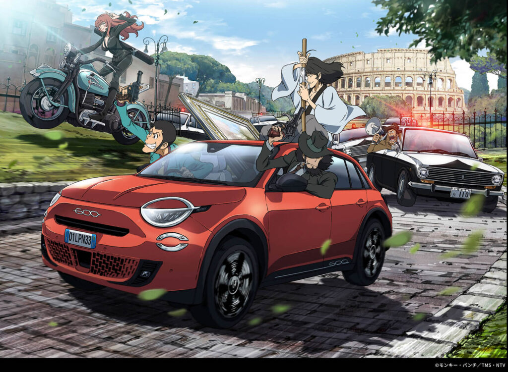 フィアットの代表モデル『500』は、「ルパン三世」の作品に主人公ルパン三世の愛車として登場。2024年9月に『500』が登場する特別なコラボレーション企画第1弾を、10月には『500e』が登場するコラボレーション企画第2弾を実施した。今回のコラボレーション企画第3弾では『600e』が登場する。