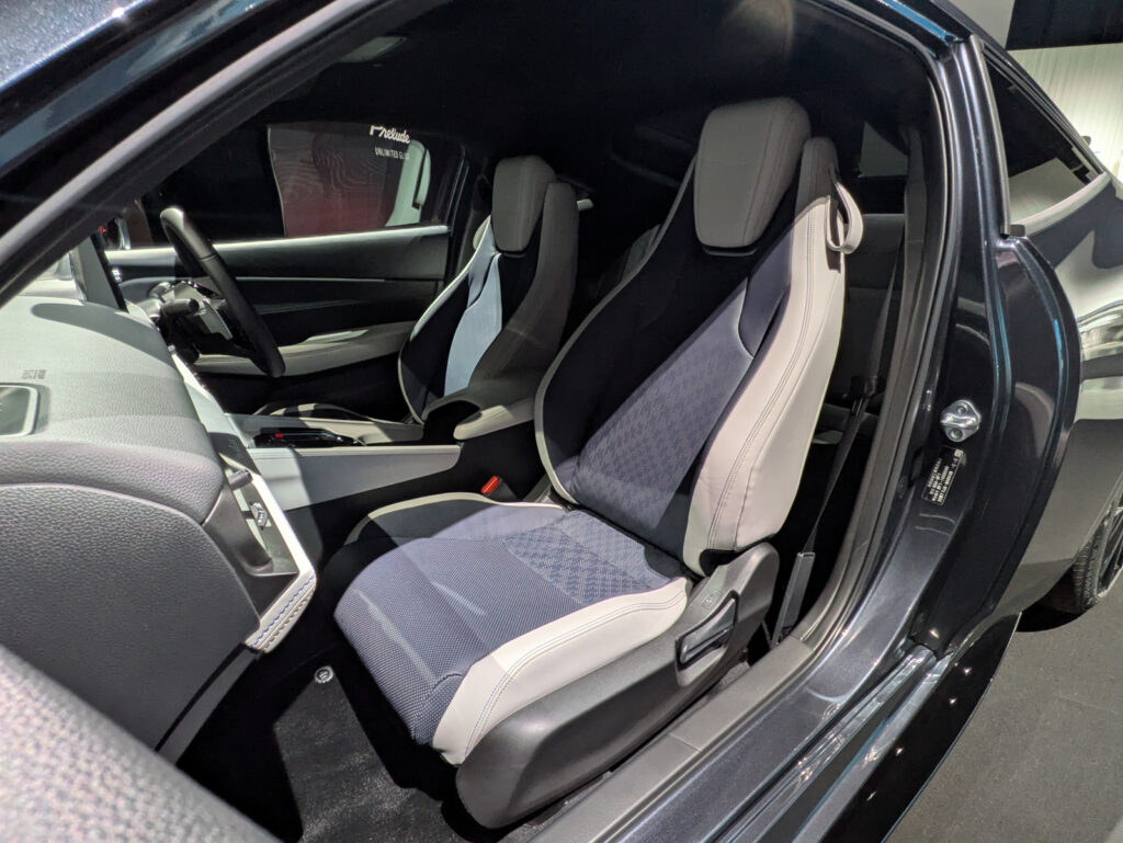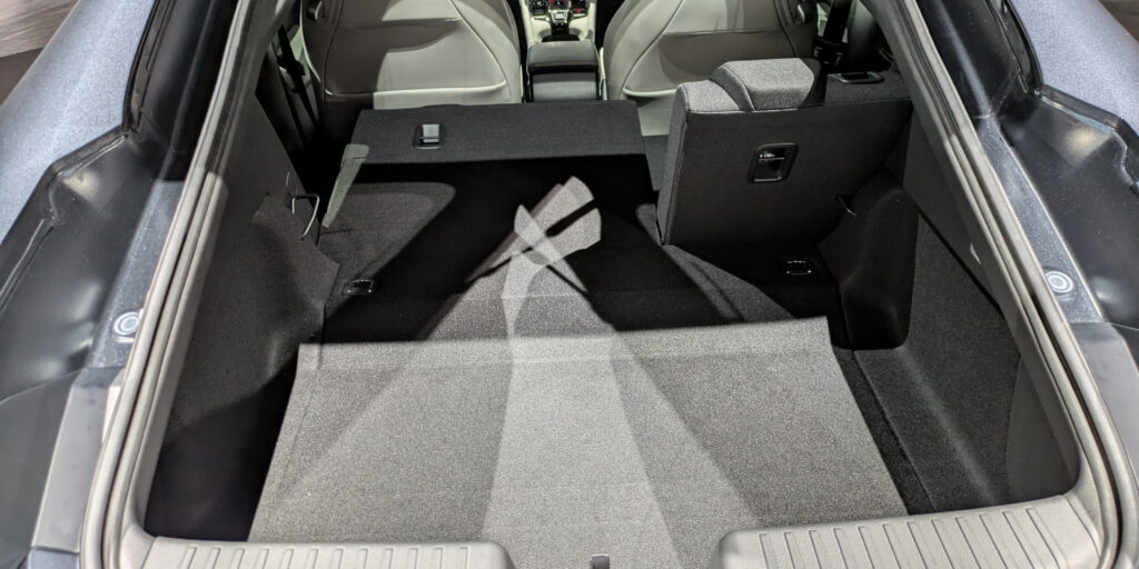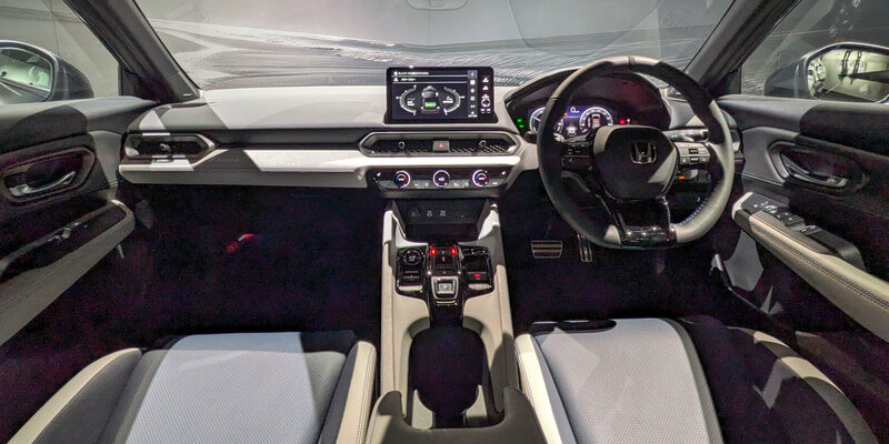 インテリアは、思わず触れたくなるような柔らかな陰影のホワイト表皮や所有する喜びを高める『PRELUDE』のロゴの刺繍、乗降時のスムーズな足の出し入れを考慮したドアライニング形状など、きめ細やかな作り込みで特別感を演出。また、運転席は、スポーツ走行に適したホールド性を高めたシートを採用。一方、助手席は、ほどよく包まれるような快適さを提供。低く水平基調の視界、Dシェイプデザインのステアリングホイール、メタル製パドル、専用のフルグラフィックメーターなど、走りへの期待感を高めるデザインに仕上げている。また、荷物の出し入れがしやすい開口部の広いテールゲート式の荷室には、スーツケース2個を乗せられ、さらに後席を倒すことで9.5型のゴルフバッグ2個、サーフボード2枚など、さまざまな荷物を積載可能としている。床面ボードの下には、収納スペースを設けていてコンビニフックや床面ボードを立てて仕切り板として使うことで、前後のスペースで荷物をわけられるなど、使い勝手の高い荷室にしている。