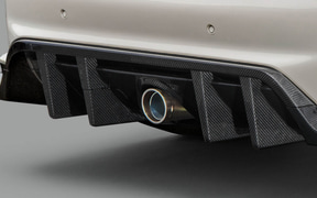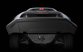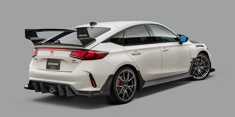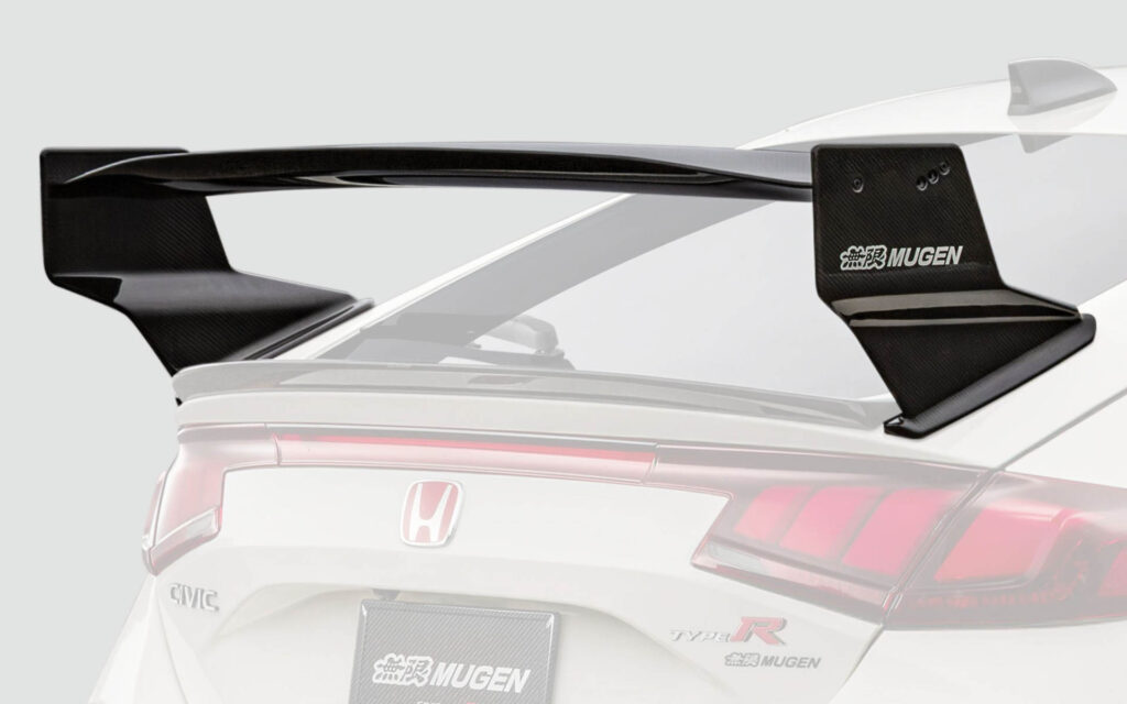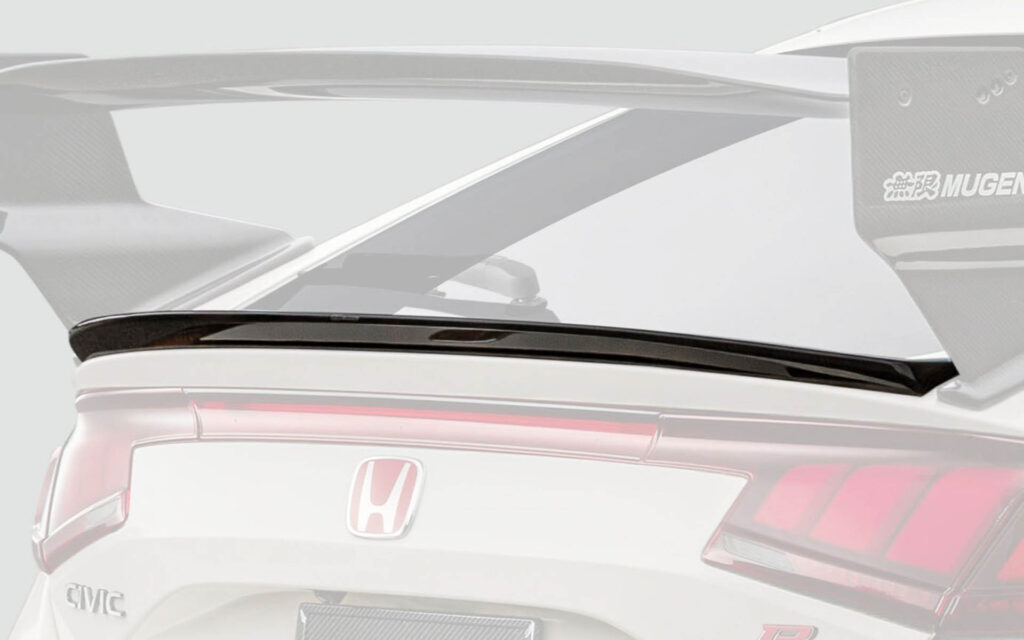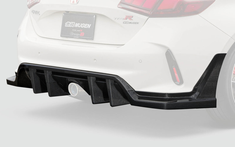 リアには、大型のディフューザー形状を採用したカーボンリアバンパーディフューザーを設定。空力解析のもと最適な形状を設定することで車体下部からの気流を整え、ダウンフォースを増大。さらに、ディフューザー上部に開口部を設けることでリアバンパー内部に滞留する空気を後方へ放出し、空気抵抗の低減を同時に実現。無限スポーツエキゾーストシステムとの同時装着専用設計となり、標準リアアンダースポイラーより約22mmダウンとなる。また、リア上部には、カーボンリアウイングとカーボンテールゲートスポイラーを設定。カーボンリアウイングでは、主翼の先端から後端にかけての幅を広く設計し、後端はガーニーフラップ形状とすることで、カーボンフロントバンパーロアスポイラーで増大したダウンフォースとのバランスを調整。可変式ウイングの採用により、走行ステージに合わせたダウンフォースの調整を可能とした。カーボンテールゲートスポイラーは、ダックテール形状を採用することで、空気抵抗を最小限に抑えながらダウンフォースの獲得に大きく寄与。カーボンフロントバンパーロアスポイラーとカーボンリアウイングとの同時装着により理想的な前後バランスの取れたダウンフォースを獲得できるように設計されている。
