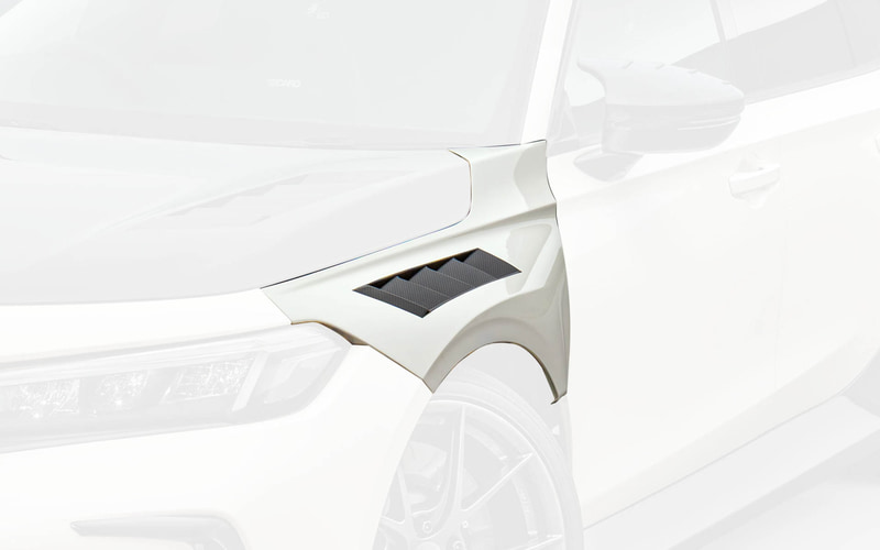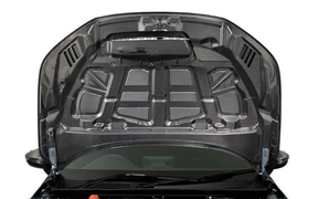 エアロダイナミクスでは、フロントに徹底した空力性能と軽量化を追求したカーボンフロントバンパーロアスポイラーを設定。ブレーキダクトやラジエーターダクト、アンダーパネルに至るまで専用設計とすることで、軽量化・冷却効率・空力性能を高い水準で実現。標準装備フロントバンパーより約42.5mmダウンとなる。また、カーボンエアロボンネット、カーボンフロントエアロフェンダーも新たに設定。カーボンエアロボンネットでは、エンジンダクトを最適な位置にレイアウトすることで、排熱効率の向上とフロントグリルからの流入風を利用してダウンフォースを獲得した。CFRP製で標準装備ボンネットより約3kgの軽量化を実現するとともに、表面はUVカットコーティング仕上げで、色あせなどの劣化を防止している。カーボンフロントエアロフェンダーでは、フロントフェンダー部分をすべてカーボンで製作して純正と付け替えることで軽量化を実現。加えて、ボンネットのエアアウトレットと角度・幅を合わせることで調和の取れたデザインとなっている。CFRP製で約1.7kgの軽量化を実現している。