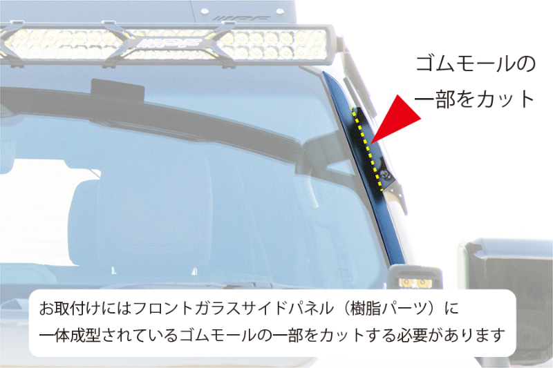 取り付けは、専用の取り付け用ブラケットなどを新たに開発し、オールインワン化製品を実現。Aピラー上部にボルトオンで装着することで、フロントウインドウ上部にLEDライトバーを取り付けられる。ただし、取り付けの際は、フロントガラスサイドパネル(樹脂パーツ)に一体成型されているゴムモールの一部をカットする必要がある。
